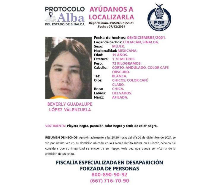 La Fiscalía General de Sinaloa solicita la colaboración ciudadana para localizar a Beverly Guadalupe López Valenzuela de 19 años de edad, quien fue vista por última vez a las 20:30 horas del 03 de diciembre de 2021 en su domicilio ubicado en la colonia Benito Juárez en Culiacán.