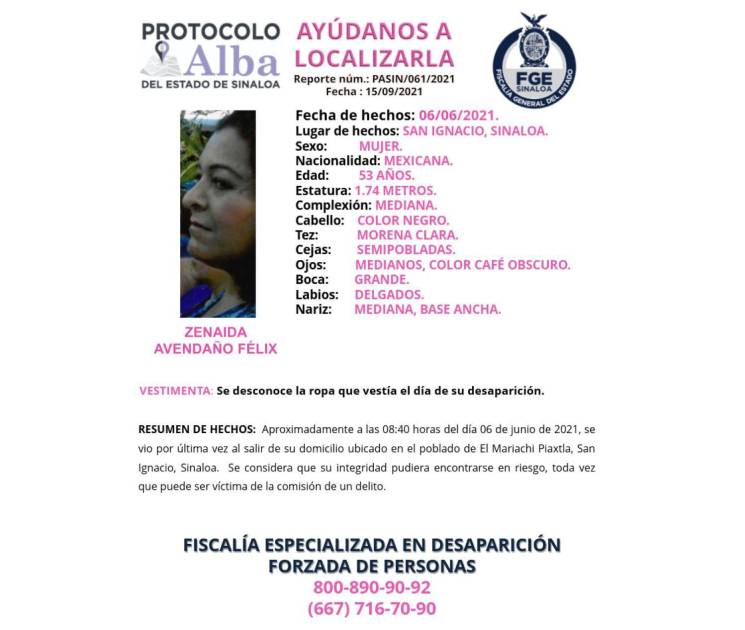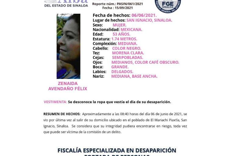 La Fiscalía General de Sinaloa solicita la colaboración ciudadana para localizar a Zenaida Avendaño Félix de 53 años de edad, quien fue vista por última vez a las 08:40 horas del 06 de junio de 2021 cuando salió de su domicilio ubicado en el poblado El Mariachi Piaxtla, San Ignacio, Sinaloa.