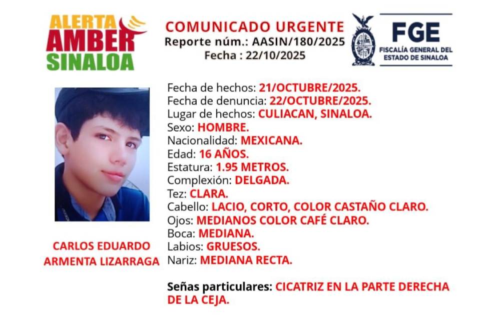 CULIACÁN._ La Fiscalía General del Estado de Sinaloa (FGE) ha emitido una Alerta Amber solicitando la colaboración ciudadana para localizar a Carlos Eduardo Armenta Lizárraga, un adolescente de 16 años reportado como desaparecido en Culiacán.