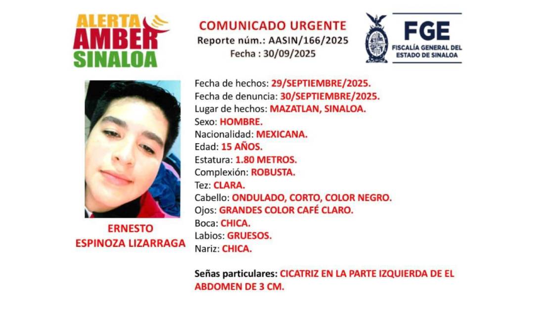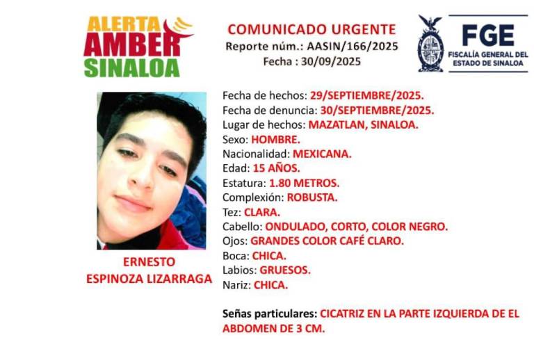 MAZATLÁN. _ La Fiscalía General del Estado de Sinaloa activó una Alerta Amber para localizar a Ernesto “N”, de 15 años, quien fue visto por última vez el pasado 29 de septiembre en la colonia Venustiano Carranza, en Mazatlán.