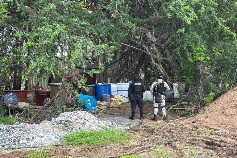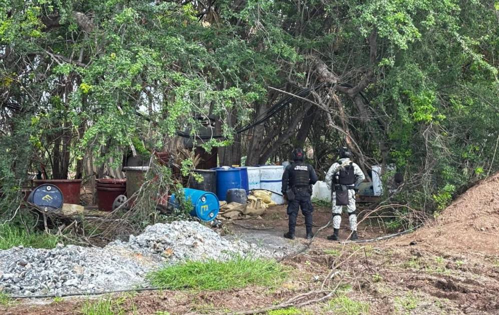 MOCORITO. _ Elementos de la Policía Estatal Preventiva, en coordinación con la Guardia Nacional, aseguraron un área destinada a la concentración de sustancias para la fabricación de drogas en el poblado Rancho Viejo, municipio de Mocorito.