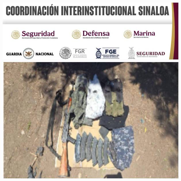 NAVOLATO._ Elementos del Ejército Mexicano, aseguraron un arma, cargadores, cartuchos y equipo táctico en las inmediaciones del Campo Paralelo 38, Navolato.
