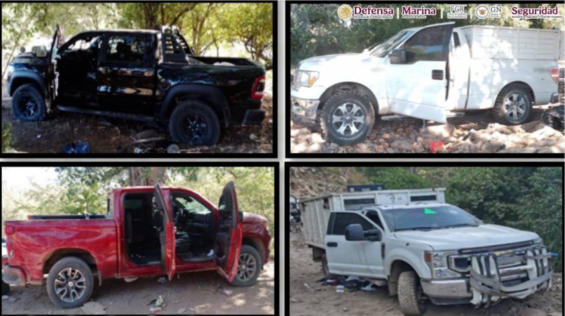 De acuerdo con información del Gobierno de México el Ejército Mexicano localizó cinco vehículos abandonados, tres de ellos con blindaje artesanal y uno de ellos con blindaje de fábrica.