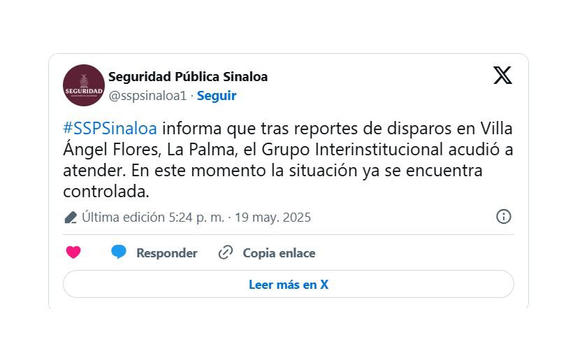 “#SSPSinaloa informa que tras reportes de disparos en Villa Ángel Flores, La Palma, el Grupo Interinstitucional acudió a atender. En este momento la situación ya se encuentra controlada”, informaron mediante el comunicado.