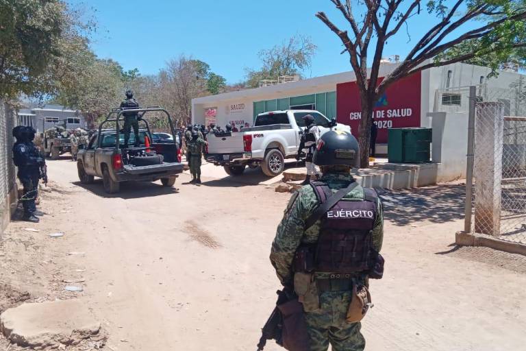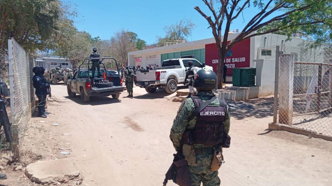 Los militares y estatales custodian el Centro de Salud del poblado donde fueron llevados los lesionados a recibir atención médica.