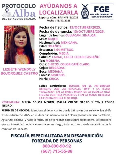 CULIACÁN. _ La Fiscalía General del Estado (FGE) activó el Protocolo Alba para la localización de Lizbeth Wendoly Bojórquez Castro, de 39 años, quien fue reportada como no localizada la noche del lunes en la sindicatura de Aguaruto, municipio de Culiacán.