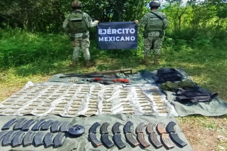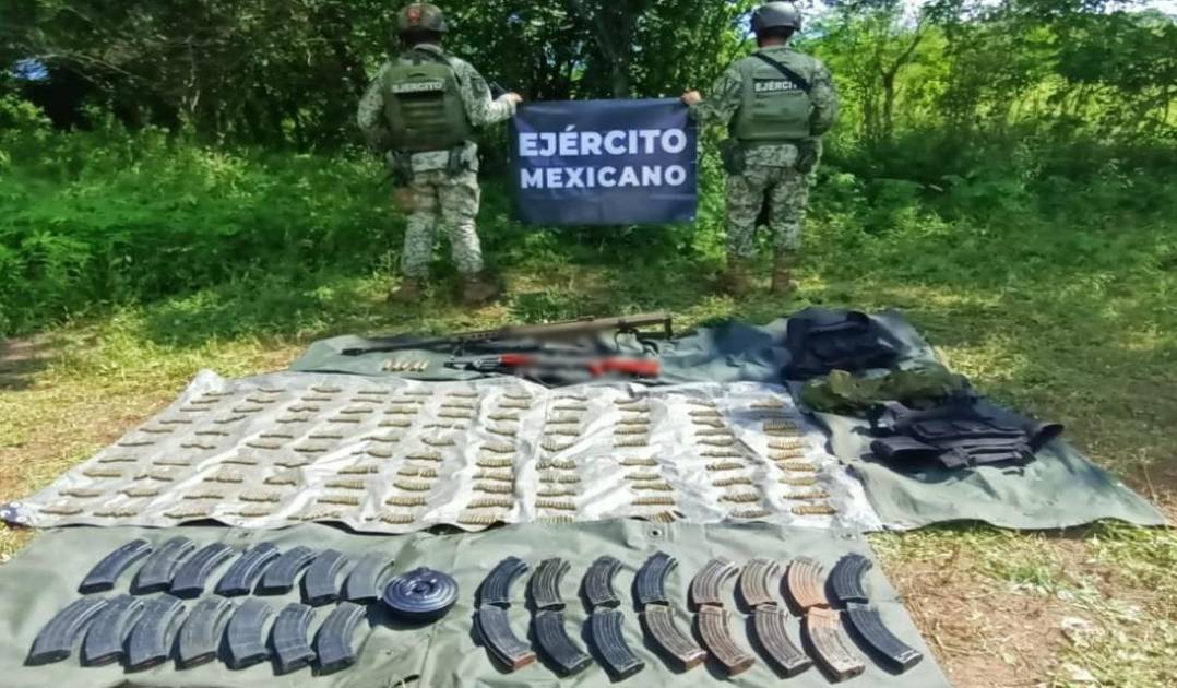 En una primera acción, realizada en el municipio de Elota, específicamente en el poblado Japuino, el Ejército decomisó un fusil Barrett calibre .50, un arma larga adicional, 32 cargadores, mil 105 cartuchos útiles y dos chalecos tácticos.