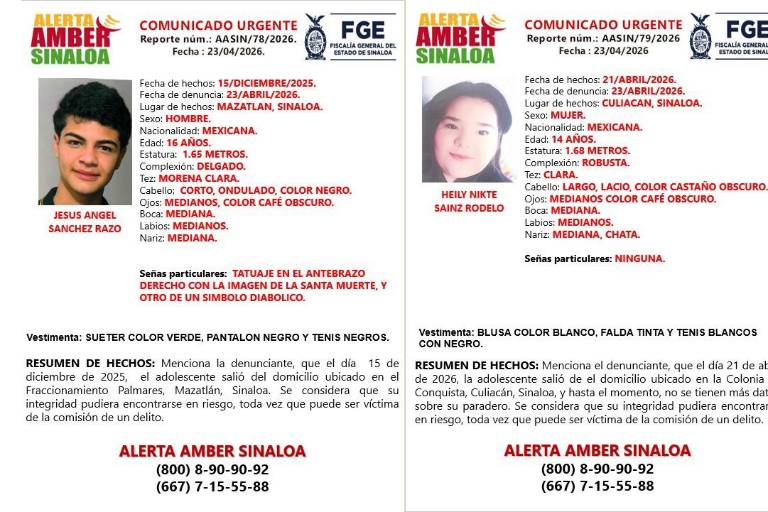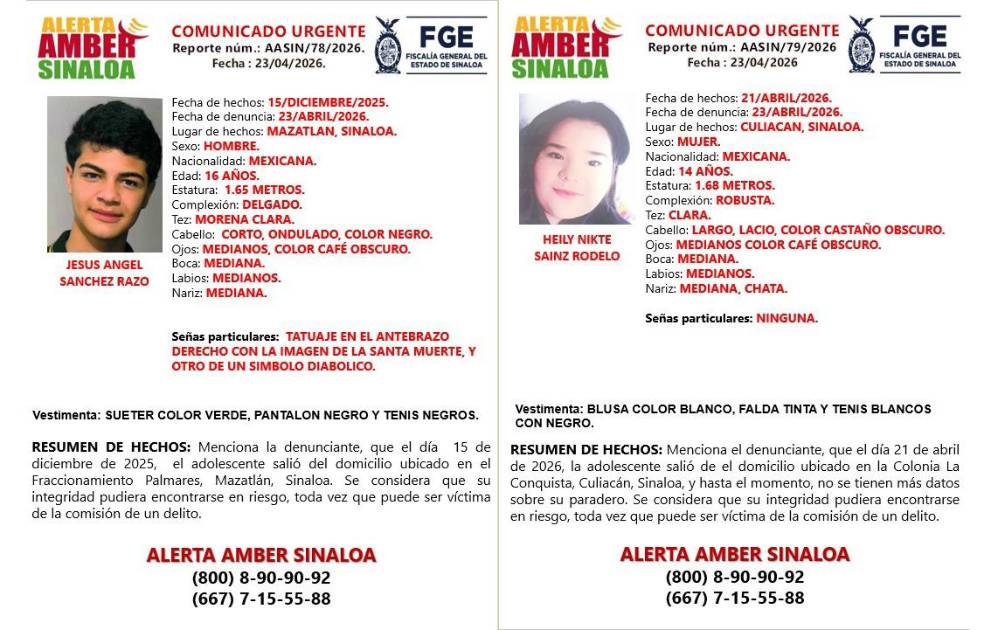 La Fiscalía General del Estado activó dos fichas de búsqueda Alerta Amber, por el extravío de Jesús Ángel Sánchez Razo y Heily Nikté Sainz Rodelo, adolescente desaparecidos en Culiacán y Mazatlán.