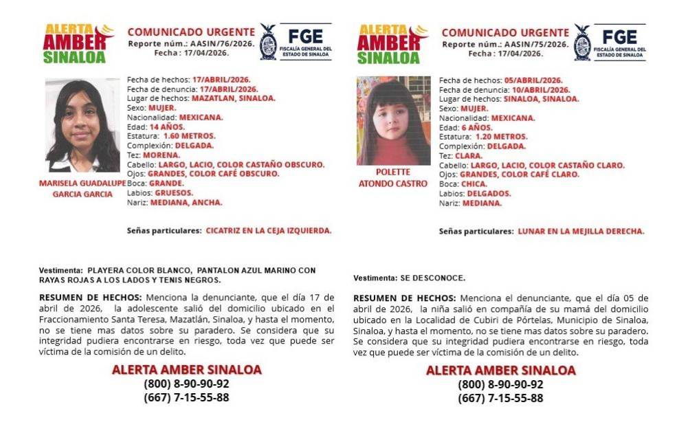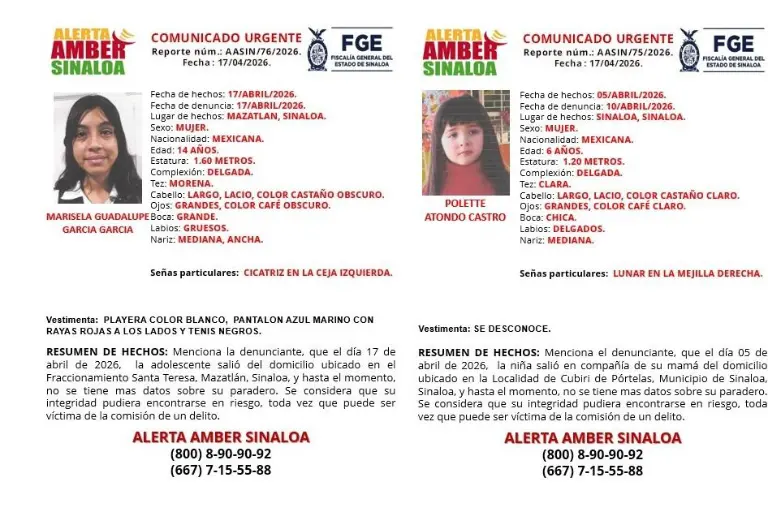 La Fiscalía General del Estado emitió dos fichas de búsqueda bajo el protocolo Alerta Amber, tras reportarse la desaparición de Marisela Guadalupe García García y Polette Atondo Castro dos niñas extraviadas en distintos puntos.