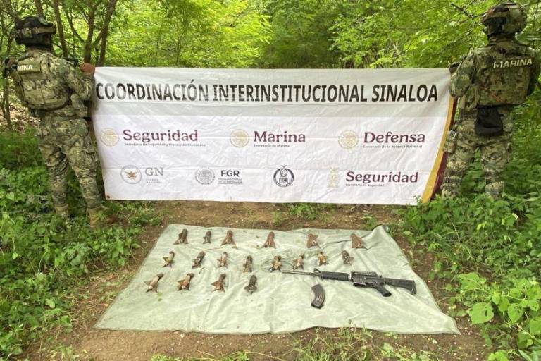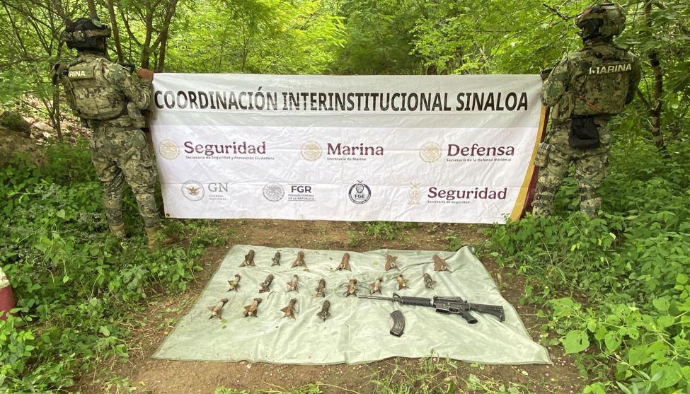 En Elota, en el poblado Paredón Colorado, elementos de la Semar aseguraron un arma larga, un cargador y 18 artefactos explosivos improvisados diseñados para ser utilizados con drones, encontrados en un campamento clandestino relacionado con actividades delictivas.