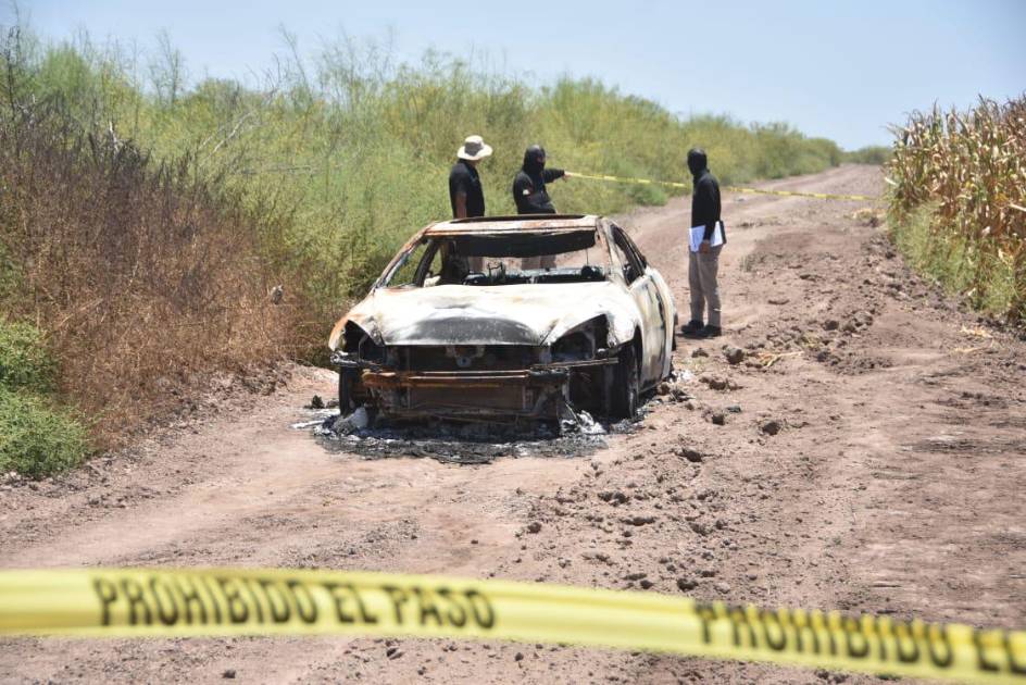 Hallan cadáver carbonizado dentro de un auto quemado en medio de cultivos, en Navolato