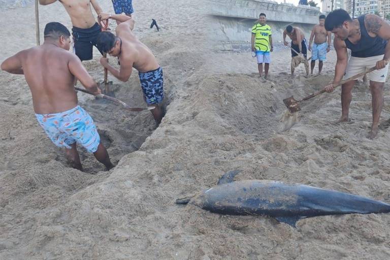 Hallan delfín sin vida en playa de Mazatlán; autoridades lo sepultan en la zona