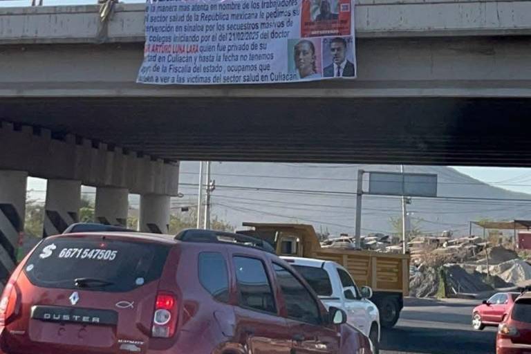 “De la manera más atenta, en nombre de los trabajadores del sector salud de la República Mexicana, le pedimos su intervención en Sinaloa por los secuestros masivos de los colegas, iniciando por el del 21 de febrero de 2025 del doctor César Arturo Luna Lara, quien fue privado de su libertad en Culiacán, y hasta la fecha no tenemos apoyo de la Fiscalía del estado. Ocupamos volteen a ver a las víctimas del sector salud en Culiacán”, se leía en la manta.