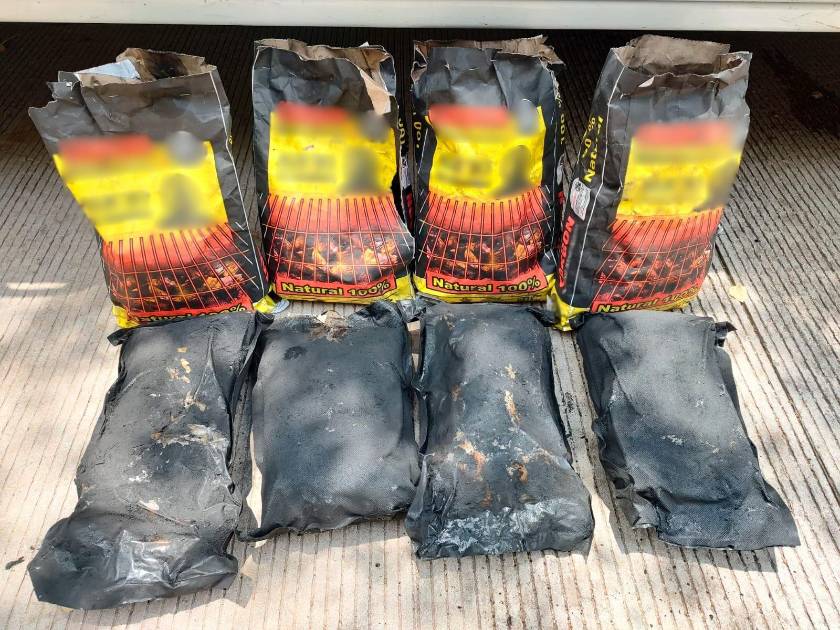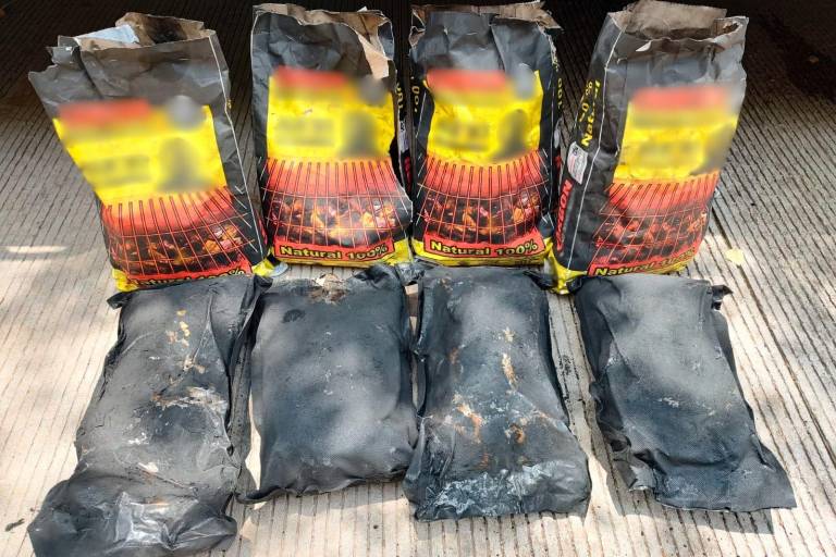 Los elementos de la Guardia Nacional inspeccionaron el envío, que consistía en cuatro bolsas que aparentaban contener carbón, pero cada una ocultaba una cubierta de plástico con hierba verde y seca con las características propias de la marihuana.