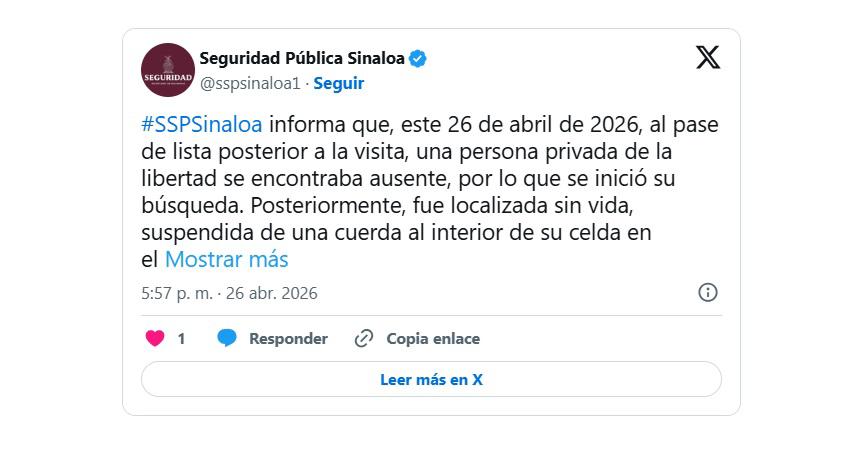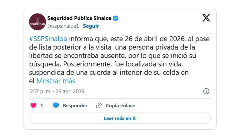 Una persona privada de la libertad fue localizada sin vida este domingo 26 de abril al interior del Centro Penitenciario de Aguaruto, en Culiacán, informó la Secretaría de Seguridad Pública de Sinaloa.
