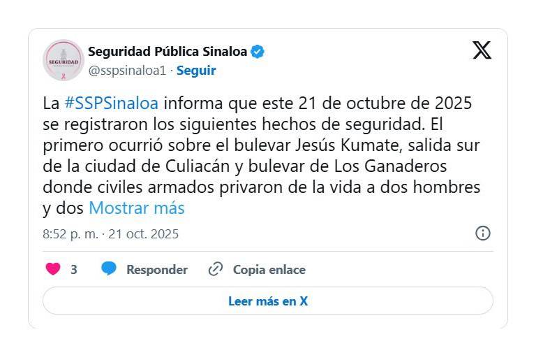 CULIACÁN._ La noche de este martes 21 de octubre se registraron dos hechos violentos en la ciudad de Culiacán que dejaron un saldo de cuatro personas muertas y cinco más heridas, informó la Secretaría de Seguridad Pública del Estado (SSPE).