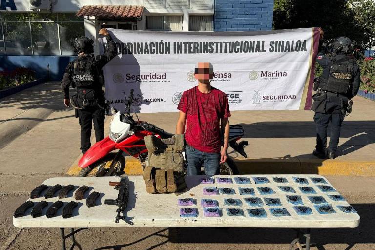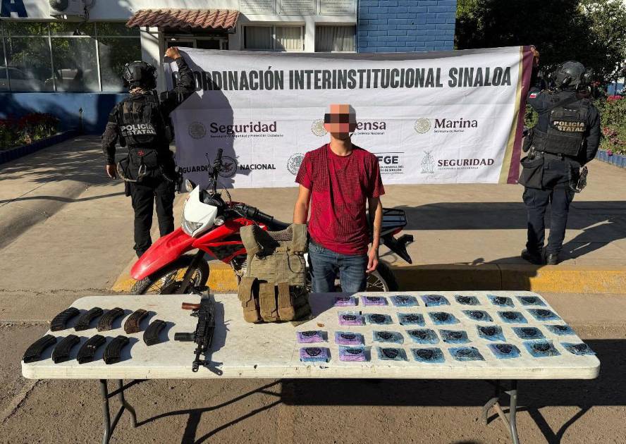 Un hombre fue detenido por elementos de seguridad en la sindicatura de Villa Benito Juárez, Navolato, tras encontrarle armas, presunta droga y una motocicleta con reporte de robo.
