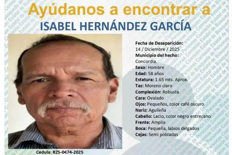 Con la leyenda “Localizado sin vida”, colectivos de buscadoras publicaron este viernes la ficha de búsqueda de Isabel Hernández García, desaparecido en Concordia desde el 14 de diciembre de 2025.