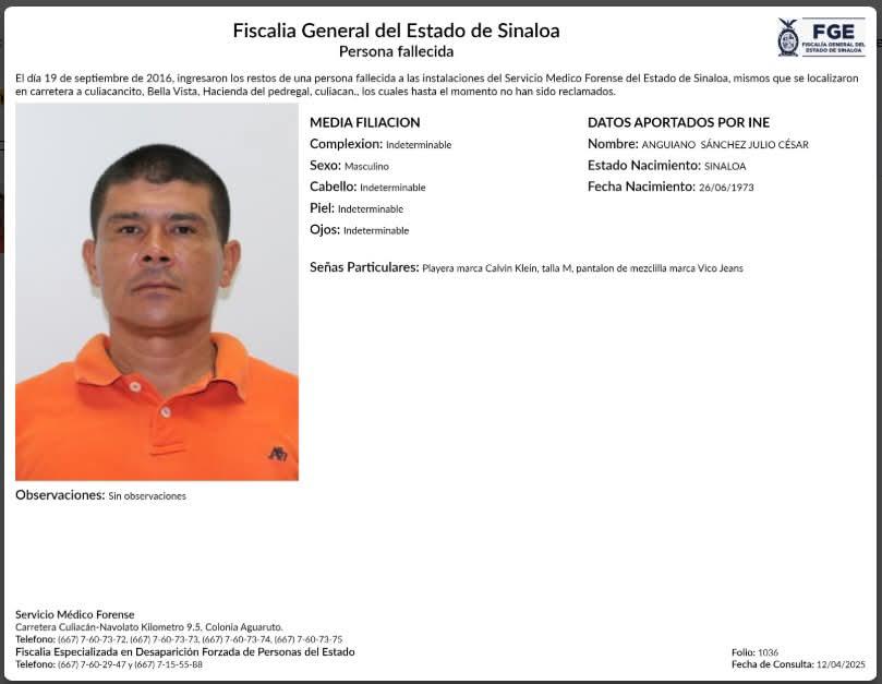 CULIACÁN. _ Luego de estar bajo resguardo por más de 9 años en las instalaciones del Servicio Médico Forense (Semefo), autoridades identificaron a un hombre que había sido localizado sin vida el pasado 19 de septiembre del año 2015 en Culiacán.