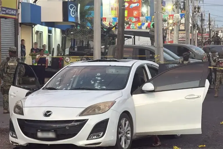 El vehículo presentó múltiples impactos de bala en el parabrisas y la carrocería, lo que hace presumir el uso de armas largas durante el ataque.