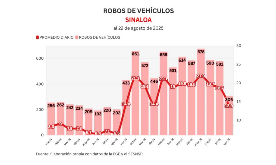 En robo de vehículo, en agosto se han registrado 305 denuncias por ese delito según datos del Secretariado Ejecutivo de Sinaloa, para un promedio de 13.9 diarios.