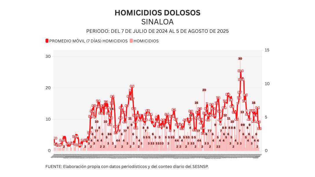 Noroeste calcula un promedio móvil diario de 7 días para medir con mayor sensibilidad la evolución del homicidio en Sinaloa. Al día de hoy, el promedio ascendió a 3.3 asesinatos diarios.