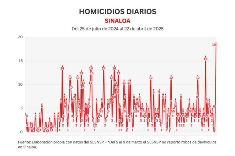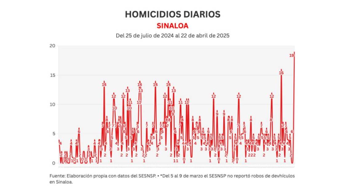 También Noroeste lleva un conteo mensual de acuerdo a lo registrado por el Secretariado Ejecutivo del Sistema Nacional de Seguridad Pública (SESNSP), en lo que va de abril se han registrado 105 homicidios para un promedio de 4.8 diarios.