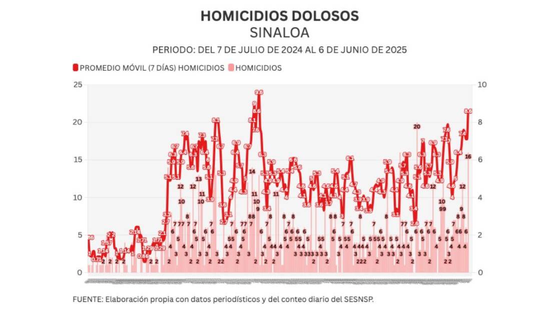 Noroeste calcula un promedio móvil diario de 7 días para medir con mayor sensibilidad la evolución del homicidio en Sinaloa. Al día de hoy, el promedio ascendió a 8.6 asesinatos diarios.