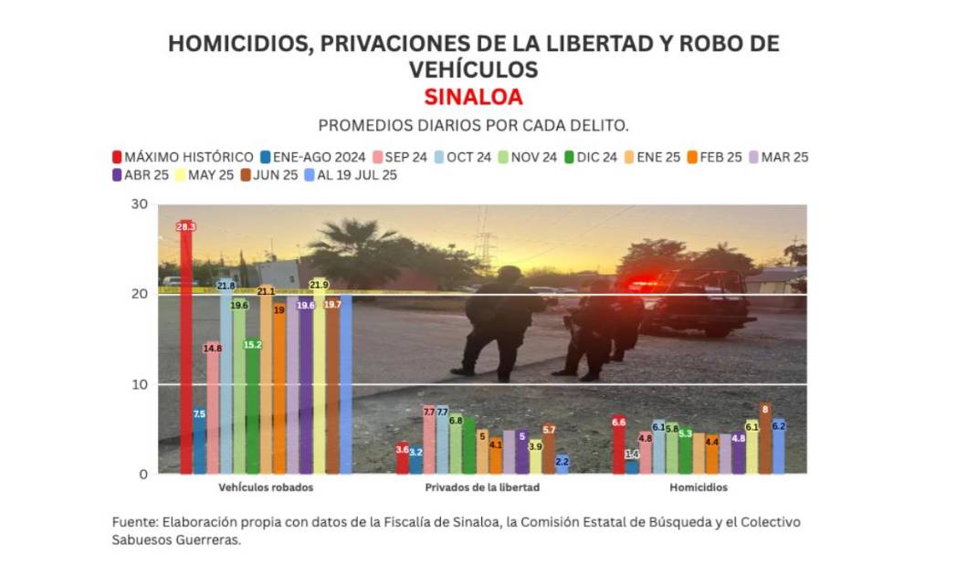 Hasta ahora, las tres violencias más relevantes para Sinaloa son los homicidios, las privaciones de la libertad y el robo de vehículos.