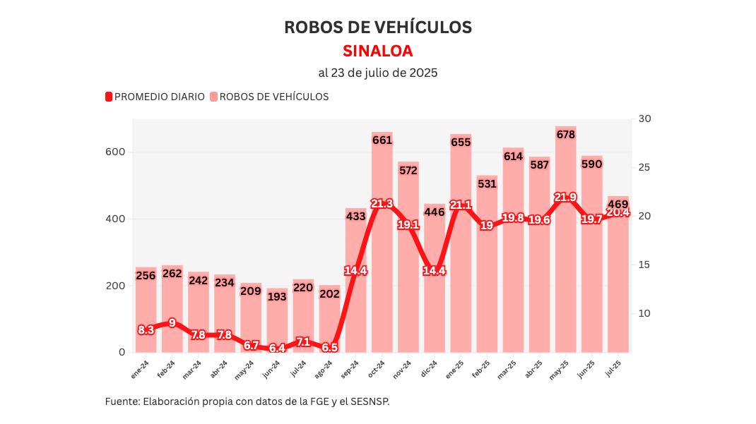 En robo de vehículo, en julio se registraron 469 denuncias por ese delito según datos del Secretariado Ejecutivo de Sinaloa, para un promedio de 20.4 diarios.