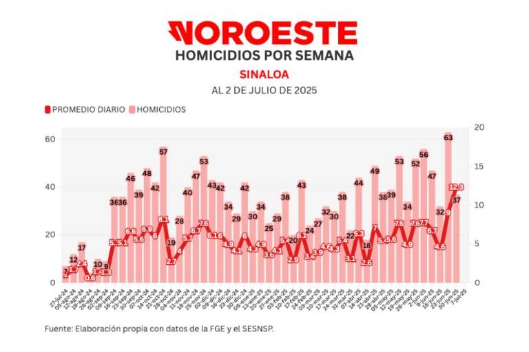 También Noroeste lleva un conteo mensual de acuerdo a lo registrado por el Secretariado Ejecutivo del Sistema Nacional de Seguridad Pública (SESNSP), en lo que va de julio se registraron 7 homicidios para un promedio de 3.5 diarios.