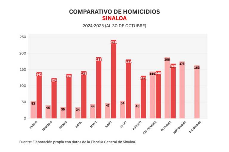También Noroeste lleva un conteo mensual de acuerdo a lo registrado por el Secretariado Ejecutivo del Sistema Nacional de Seguridad Pública (SESNSP), en octubre se han registrado 168 homicidios para un promedio de 5.6 diarios.