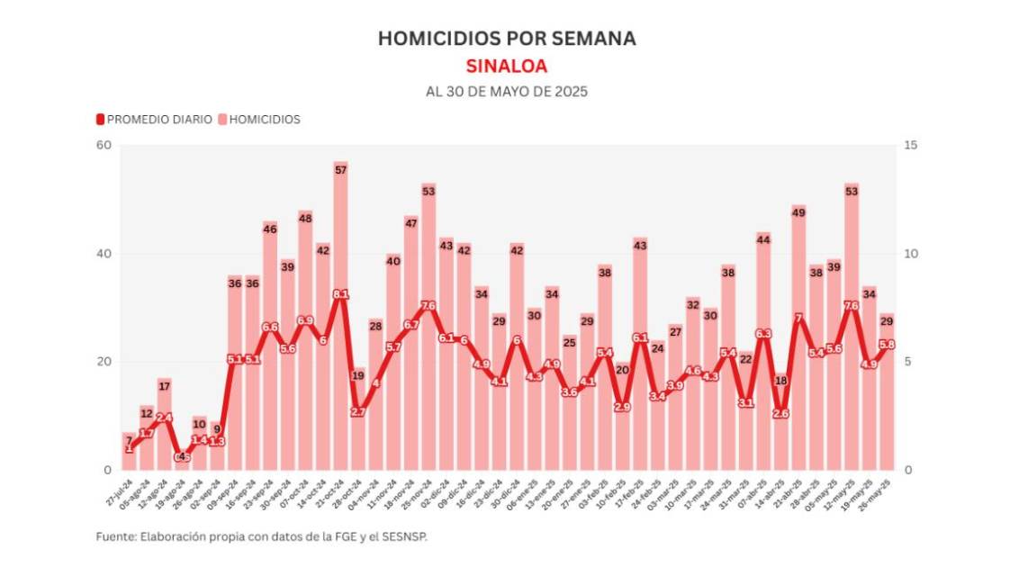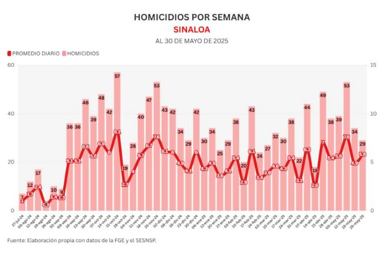 Noroeste calcula un promedio móvil diario de 7 días para medir con mayor sensibilidad la evolución del homicidio en Sinaloa. Al día de hoy, el promedio ascendió a 6.5 asesinatos diarios.