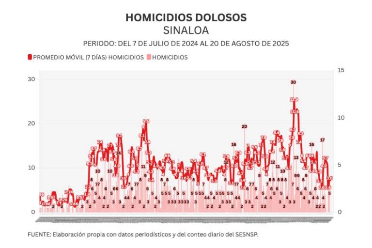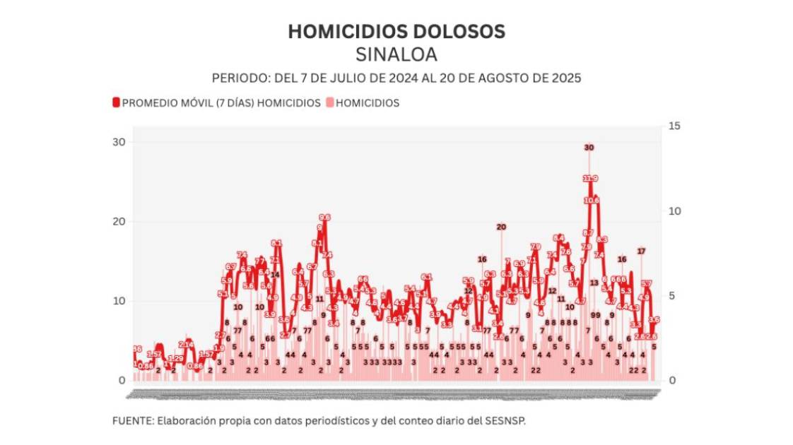 Noroeste calcula un promedio móvil diario de 7 días para medir con mayor sensibilidad la evolución del homicidio en Sinaloa. Al día de hoy, el promedio ascendió a 3.3 asesinatos diarios.