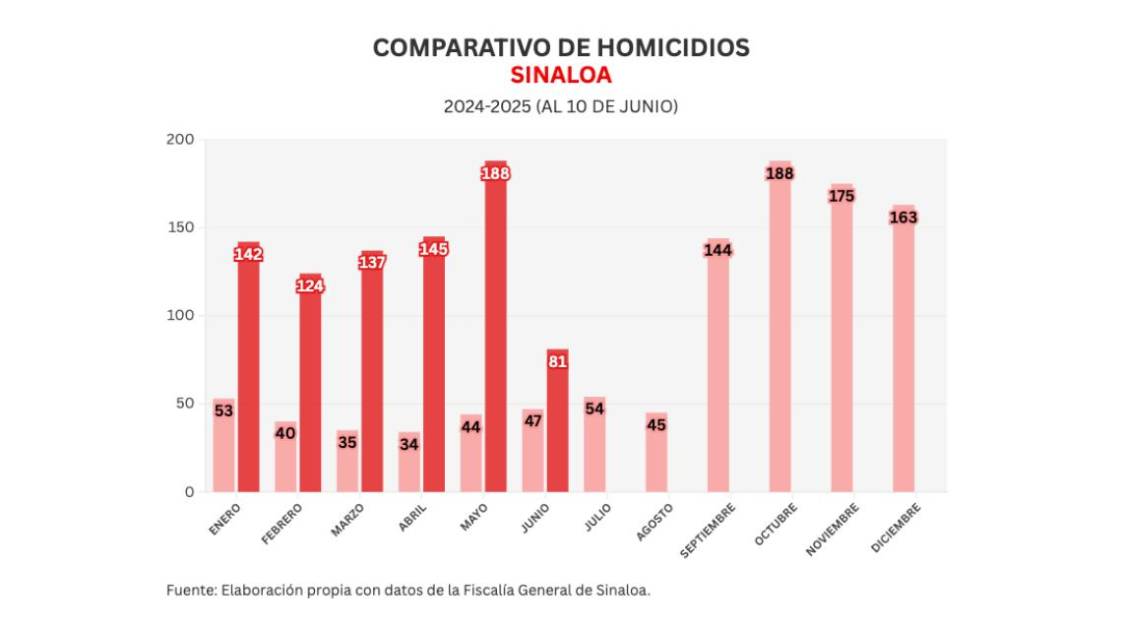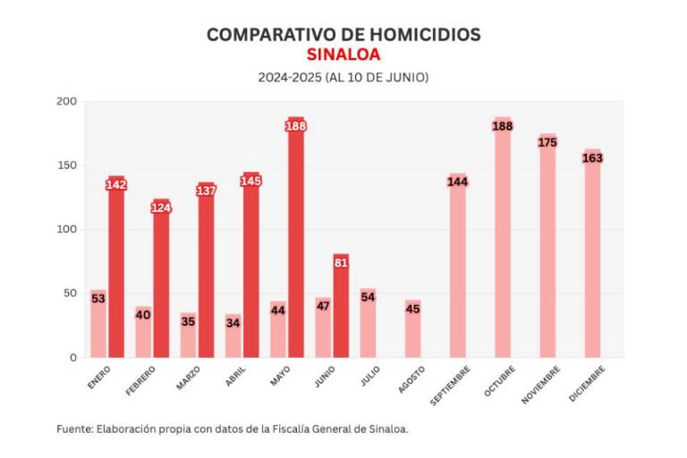 También Noroeste lleva un conteo mensual de acuerdo a lo registrado por el Secretariado Ejecutivo del Sistema Nacional de Seguridad Pública (SESNSP), en lo que va de junio se han registrado 81 homicidios para un promedio de 8.1 diarios.