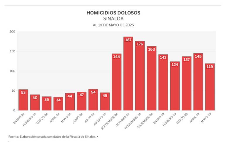 También Noroeste lleva un conteo mensual de acuerdo a lo registrado por el Secretariado Ejecutivo del Sistema Nacional de Seguridad Pública (SESNSP), en lo que va de mayo se han registrado 119 homicidios para un promedio de 6.3 diarios.