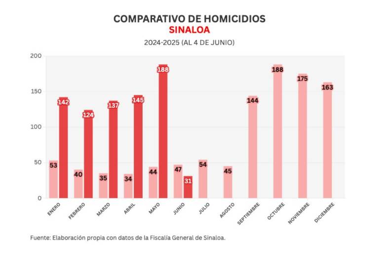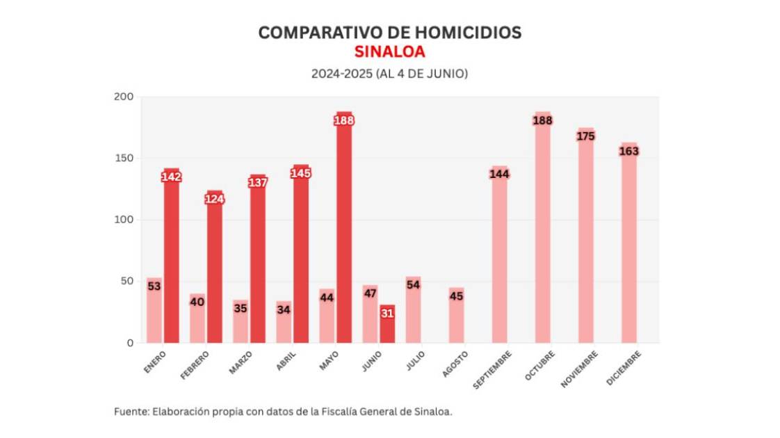También Noroeste lleva un conteo mensual de acuerdo a lo registrado por el Secretariado Ejecutivo del Sistema Nacional de Seguridad Pública (SESNSP), en lo que va de junio se han registrado 31 homicidios para un promedio de 7.8 diarios.