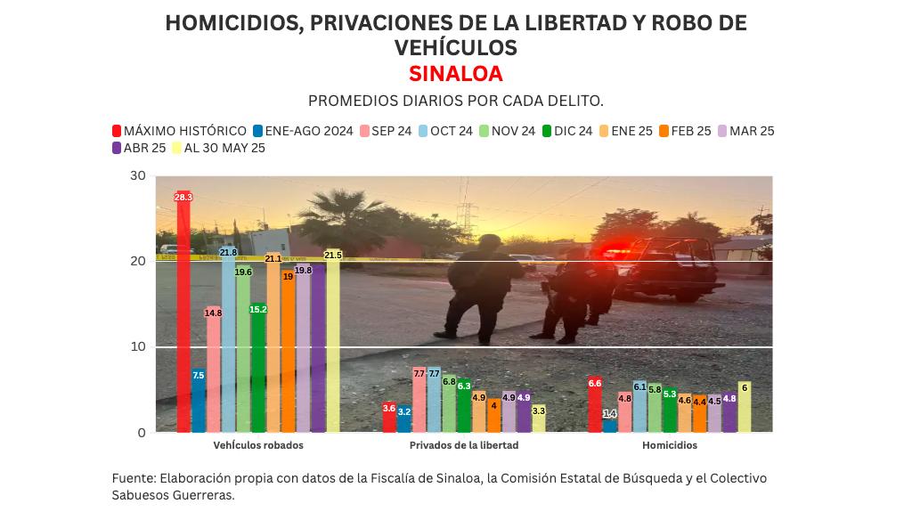 Hasta ahora, las tres violencias más relevantes para Sinaloa son los homicidios, las privaciones de la libertad y el robo de vehículos.