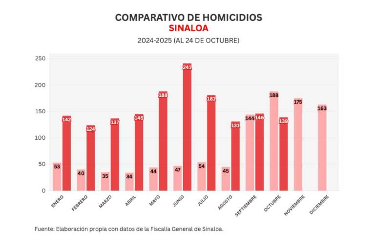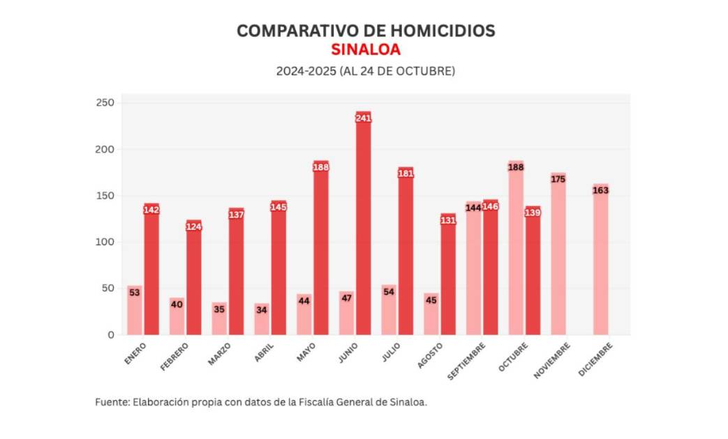 También Noroeste lleva un conteo mensual de acuerdo a lo registrado por el Secretariado Ejecutivo del Sistema Nacional de Seguridad Pública (SESNSP), en octubre se han registrado 139 homicidios para un promedio de 5.8 diarios.