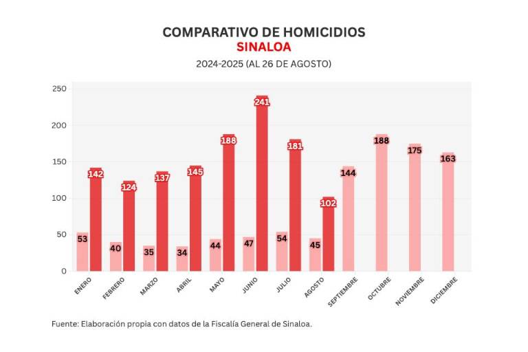 También Noroeste lleva un conteo mensual de acuerdo a lo registrado por el Secretariado Ejecutivo del Sistema Nacional de Seguridad Pública (SESNSP), en lo que va de agosto se registraron 102 homicidios para un promedio de 3.9 diarios.