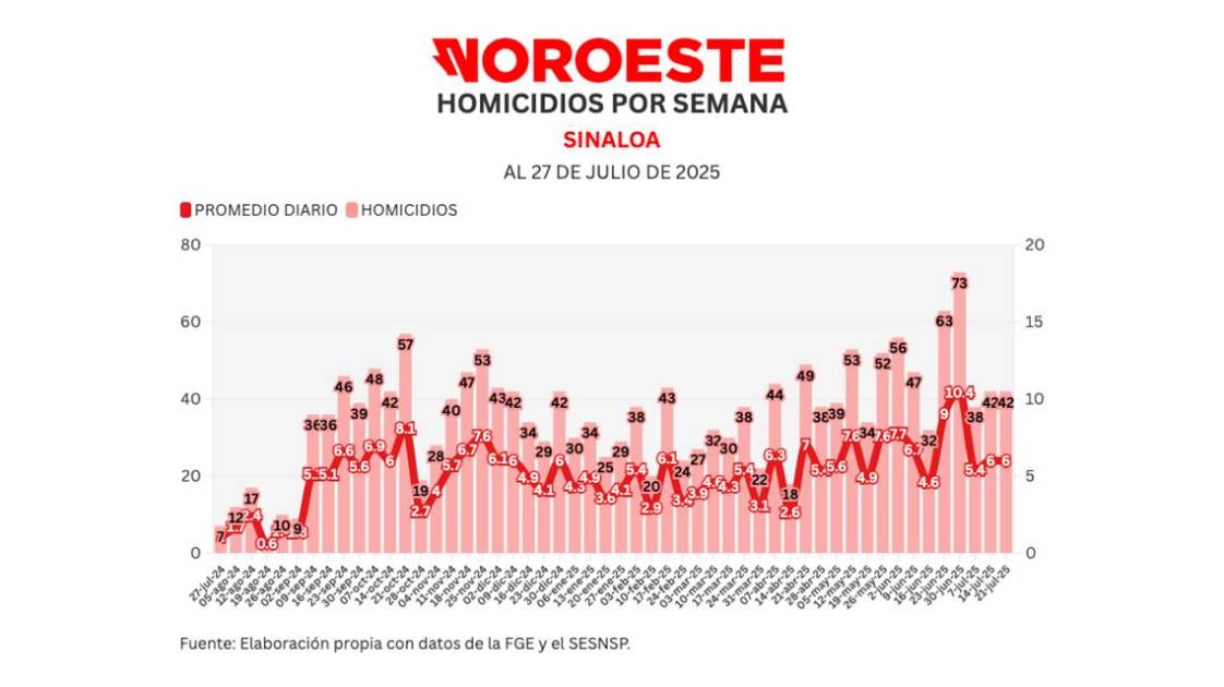 Este domingo 27 de julio se registraron 5 homicidios en Sinaloa, con lo que la semana 46 de la disputa Guzmán-Zambada concluyó con 42 asesinatos en total, para un promedio de 6 diarios y exactamente igual que la semana anterior.
