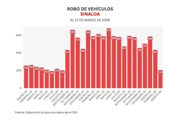 En robo de vehículo, en marzo se han registrado 204 denuncias por ese delito según datos del Secretariado Ejecutivo de Sinaloa, para un promedio de 12.0 diarios.