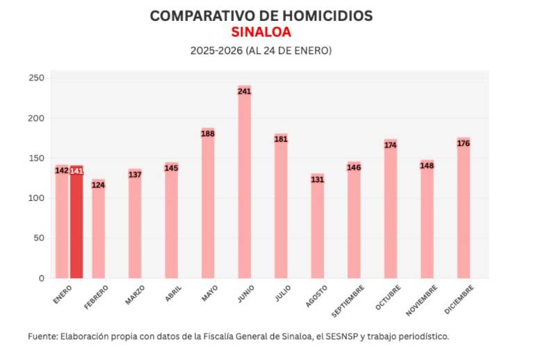 También Noroeste lleva un conteo mensual de acuerdo a lo registrado por el Secretariado Ejecutivo del Sistema Nacional de Seguridad Pública (SESNSP), en enero se han registrado 141 homicidios para un promedio de 5.9 diarios.