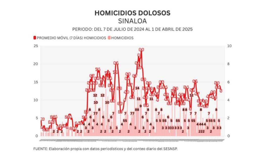 Noroeste calcula un promedio móvil diario de 7 días para medir con mayor sensibilidad la evolución del homicidio en Sinaloa. Al día de hoy, el promedio ascendió a 5 asesinatos diarios.