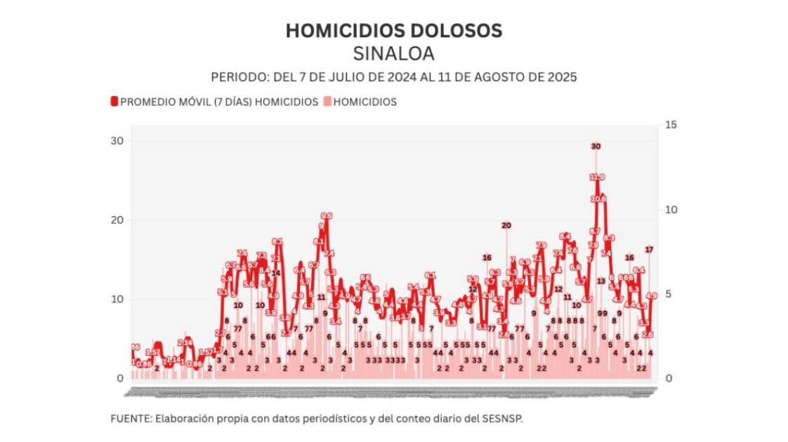 Noroeste calcula un promedio móvil diario de 7 días para medir con mayor sensibilidad la evolución del homicidio en Sinaloa. Al día de hoy, el promedio ascendió a 4.9 asesinatos diarios.
