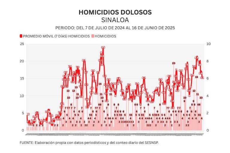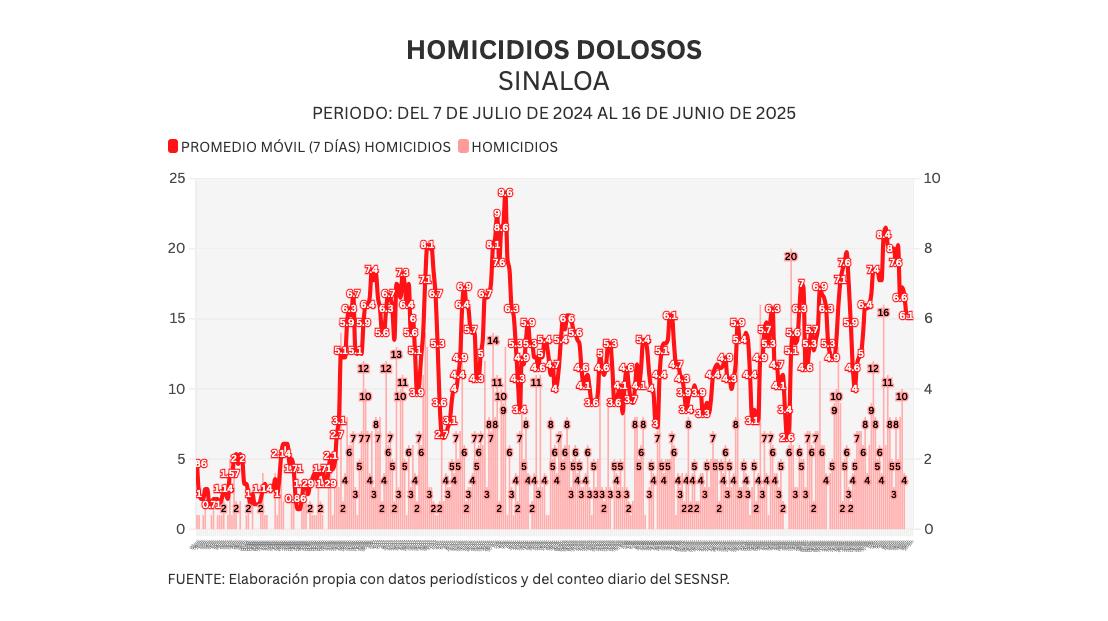 Noroeste calcula un promedio móvil diario de 7 días para medir con mayor sensibilidad la evolución del homicidio en Sinaloa. Al día de hoy, el promedio ascendió a 6.1 asesinatos diarios.