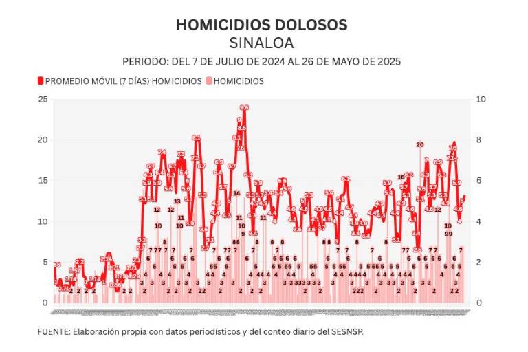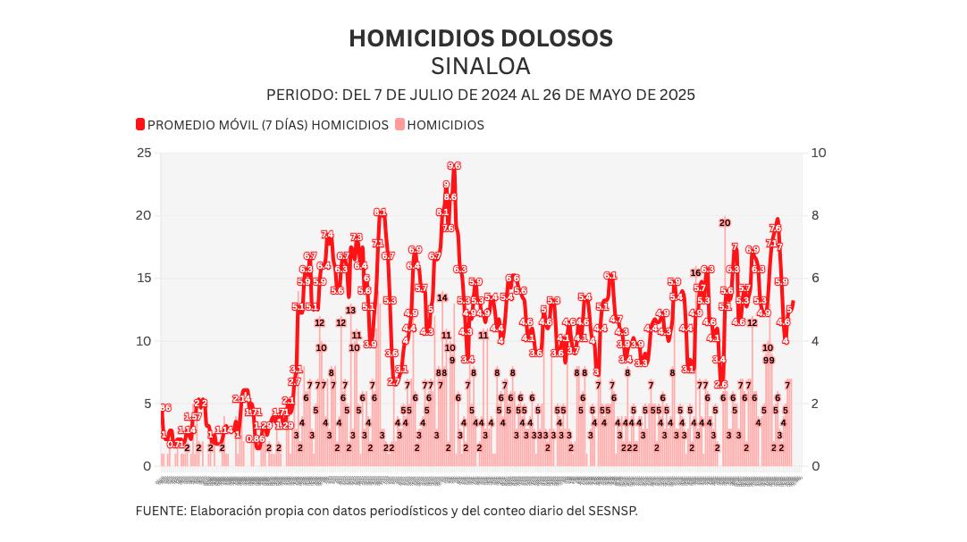 Noroeste calcula un promedio móvil diario de 7 días para medir con mayor sensibilidad la evolución del homicidio en Sinaloa. Al día de hoy, el promedio ascendió a 5.3 asesinatos diarios.
