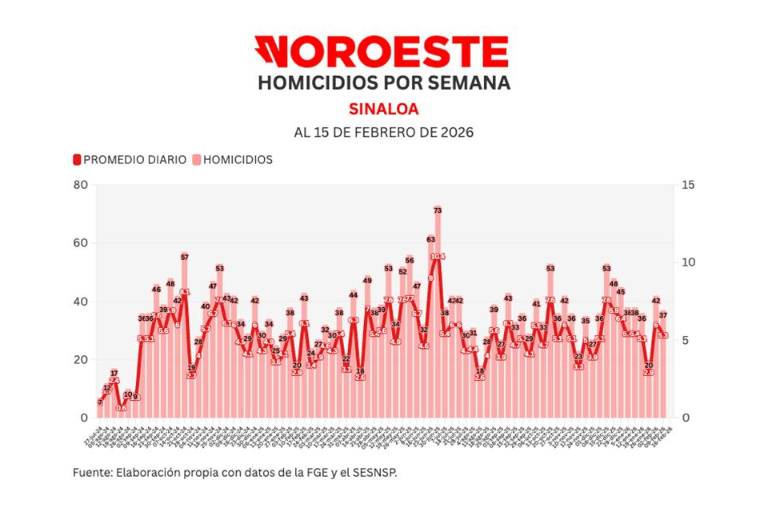 También Noroeste lleva un conteo mensual de acuerdo a lo registrado por el Secretariado Ejecutivo del Sistema Nacional de Seguridad Pública (SESNSP), en febrero se han registrado 82 homicidios para un promedio de 5.5 diarios.