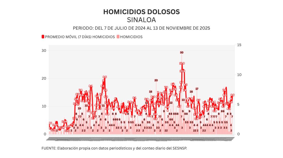 Noroeste calcula un promedio móvil diario de 7 días para medir con mayor sensibilidad la evolución del homicidio en Sinaloa. Al día de hoy, el promedio ascendió a 6.6 asesinatos diarios.