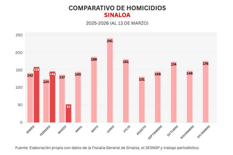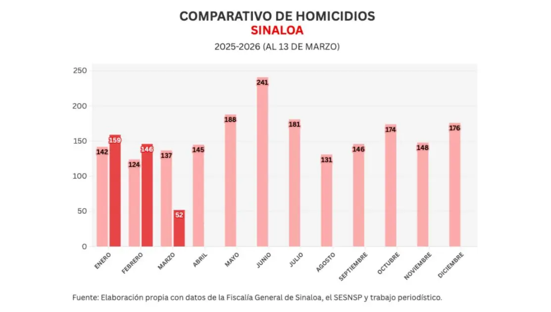 También Noroeste lleva un conteo mensual de acuerdo a lo registrado por el Secretariado Ejecutivo del Sistema Nacional de Seguridad Pública (SESNSP), en marzo se han registrado 52 homicidios para un promedio de 4.0 diarios.